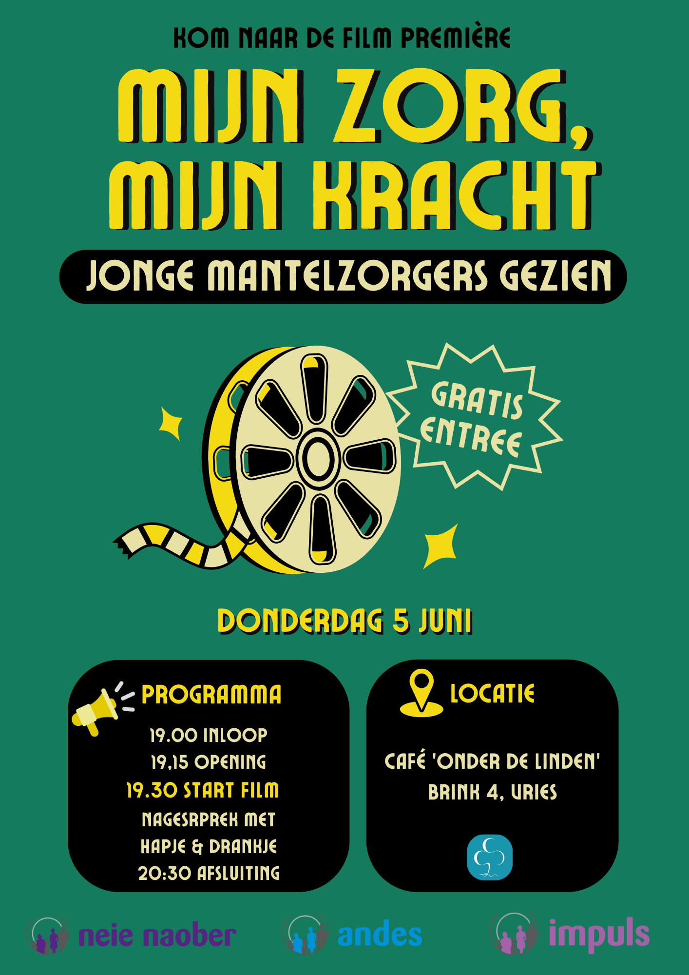 Donderdag 5 juni is de film Mijn zorg, mijn kracht in première gegaan. De video is gemaakt door jongerenwerkers van welzijnsorganisaties Neie Naober, Andes en Impuls. Hierin delen jonge mantelzorgers hun persoonlijke verhaal. Ze geven een kijkje in hun dagelijks leven, waarin ze een rol spelen die vaak verder gaat dan je van een jongere zou verwachten.